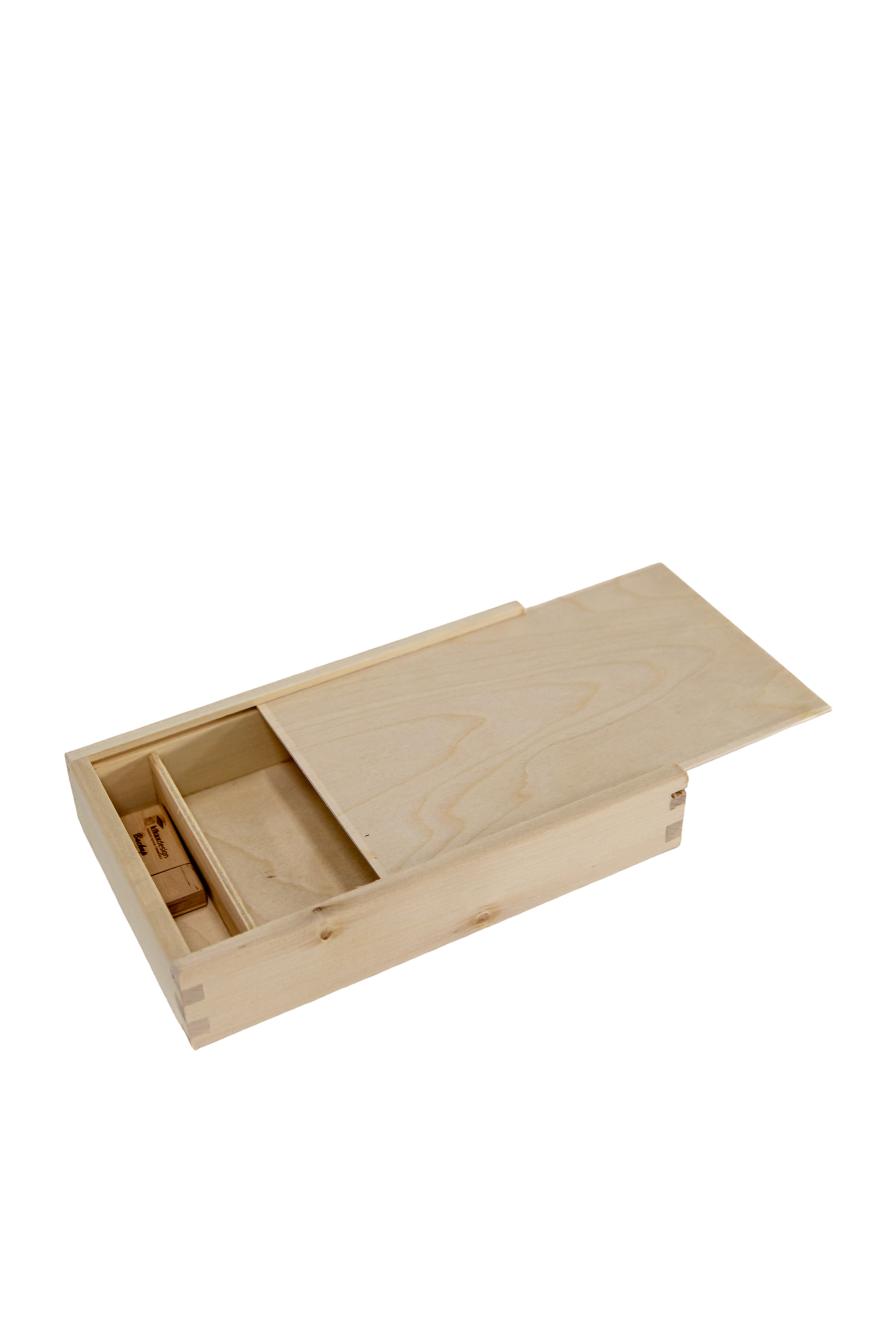 Wooden boxes with a sliding lid for USB wooden sticks, photos / DVDs are made of solid pine and multilayer birch. Natural sanded wood leaves a nice feeling of warmth to the touch, and an atmosphere of merging with nature. The PBD model is adapted in dimensions, with the placement of our USB wooden stick, to the dimensions of a DVD (of course without a plastic box), while the PBF and PBF18 models have photo compartment dimensions of 13*10 and 18*13 cm for the latter, respectively. Recently, we have also offered 20×15 cm photo boxes, model K-106Pbf20. Decorated with a little raffia, and laser engraving of the photo studio and/or the names of the newlyweds, they create an ideal smaller package.